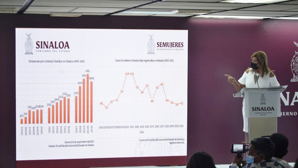 Durante la conferencia «La Semanera» en el Palacio de Gobierno, Tere Guerra, Secretaria de SEMUJERES mostró las estadisticas oficiales de los casos de denuncias de violencia familiar y el listado de feminicidios en Sinaloa. «Las estadisticas nos da un panorama de como estamos en Sinaloa en temas de feminicidios, como