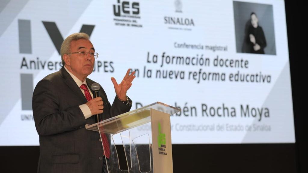 En el marco del noveno aniversario de la Universidad Pedagógica del Estado de Sinaloa (UPES), el gobernador Rubén Rocha Moya impartió la conferencia magistral titulada “La formación docente en la nueva reforma educativa”, la cual estuvo dirigida a la comunidad estudiantil, con quienes charló por espacio de más de una