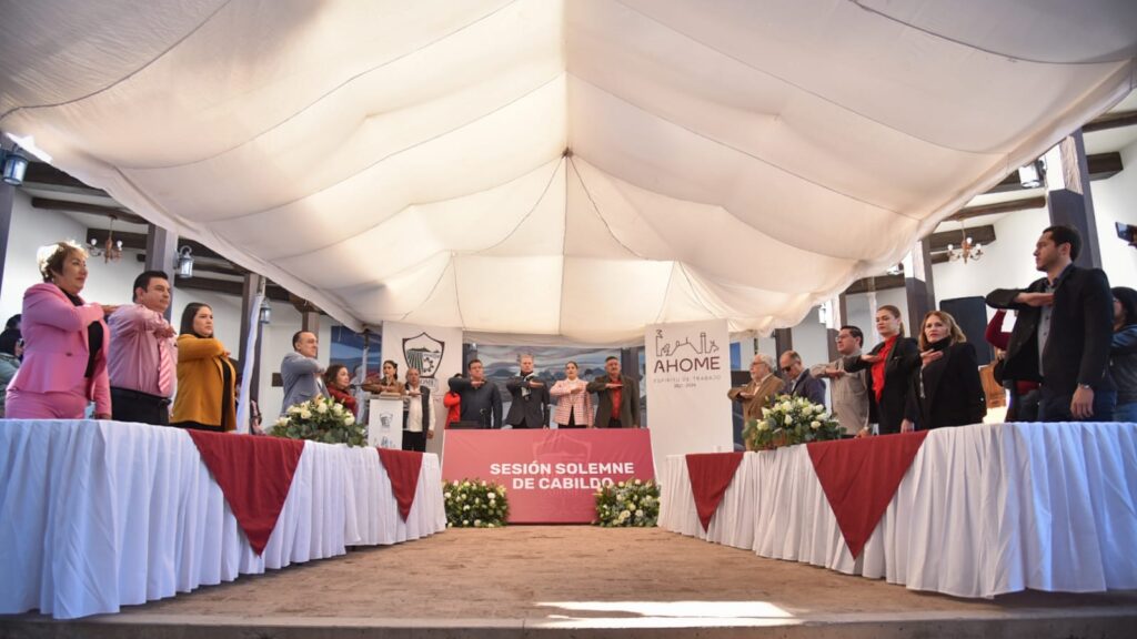 Autoridades municipales celebraron Sesión Solemne de Cabildo en la emblemática Casa Azul del Pueblo Señorial de la Villa de Ahome, para conmemorar el 107 aniversario de la fundación del Ayuntamiento de Ahome, y entregar reconocimientos a ciudadanos de esa sindicatura por su contribución social. La reunión de trabajo fue presidida