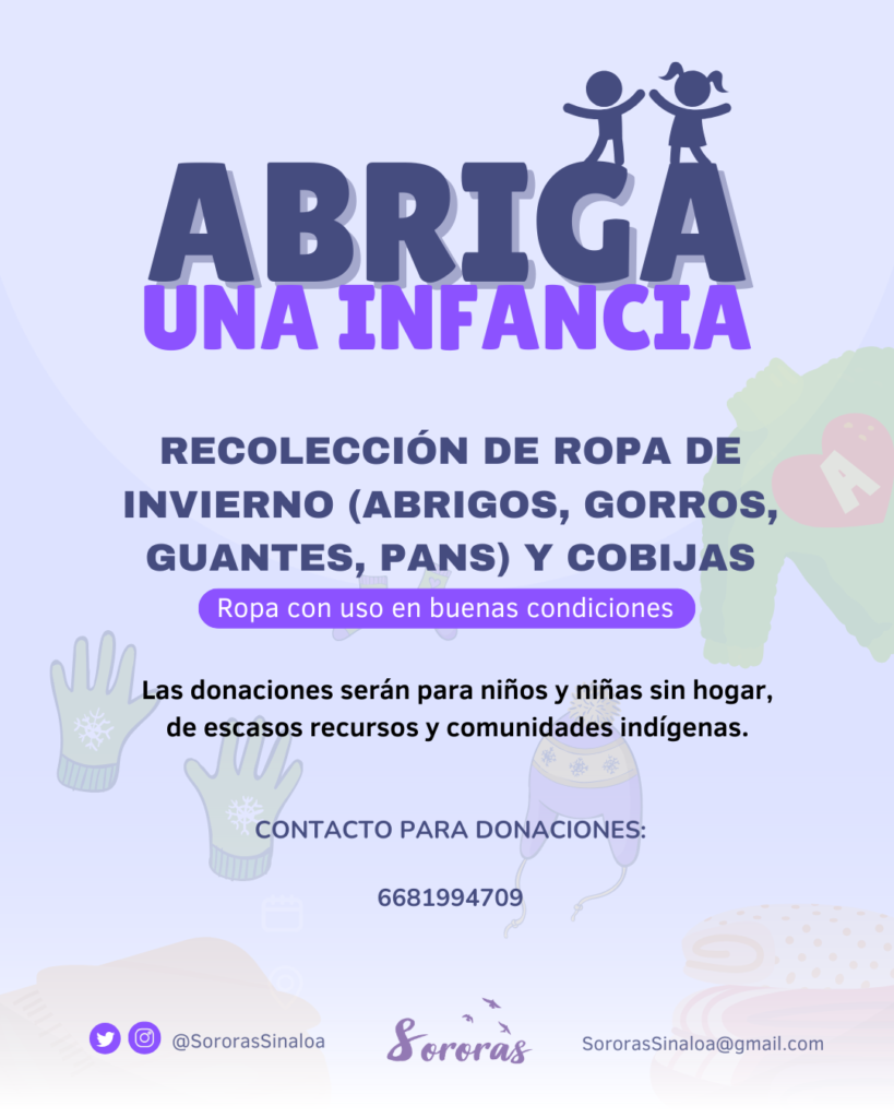 A través de la campaña “Abriga una Infancia” la organización Sororas Sinaloa busca recolectar abrigos, pants, guantes, gorros, cobijas y ropa de invierno para infancias de escasos recursos y que se encuentran en situaciones de vulnerabilidad o que no tienen un hogar donde refugiarse del frío.