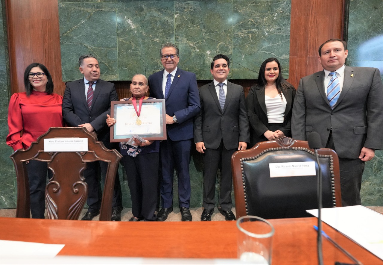 Desde su entrada al Congreso, cuando fue recibida con una lluvia de aplausos, el rostro de la señora Juliana Zepeda se vio apretado para no soltar el llanto. Finalmente las lágrimas se liberaron cuando se le entregó un diploma y se le colocó una medalla que luce en una de sus caras el escudo de Sinaloa y en la otra el escudo del Congreso del Estado de Sinaloa, además de un premio en efectivo de 25 mil pesos.