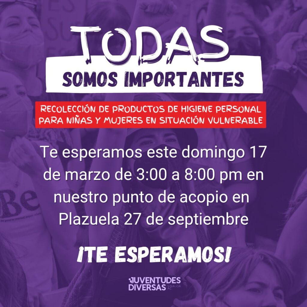 Con la finalidad de ayudar y apoyar a mujeres y niñas en condiciones de vulnerabilidad de la ciudad de Los Mochis, la asociación Juventudes Diversas de Sinaloa inició la campaña “Todas somos importantes” donde estarán recolectando donaciones de productos de higiene personal (Jabón corporal, jabón íntimo, pañales para bebé, toallas húmedas, desodorante), ropa y medicamentos.