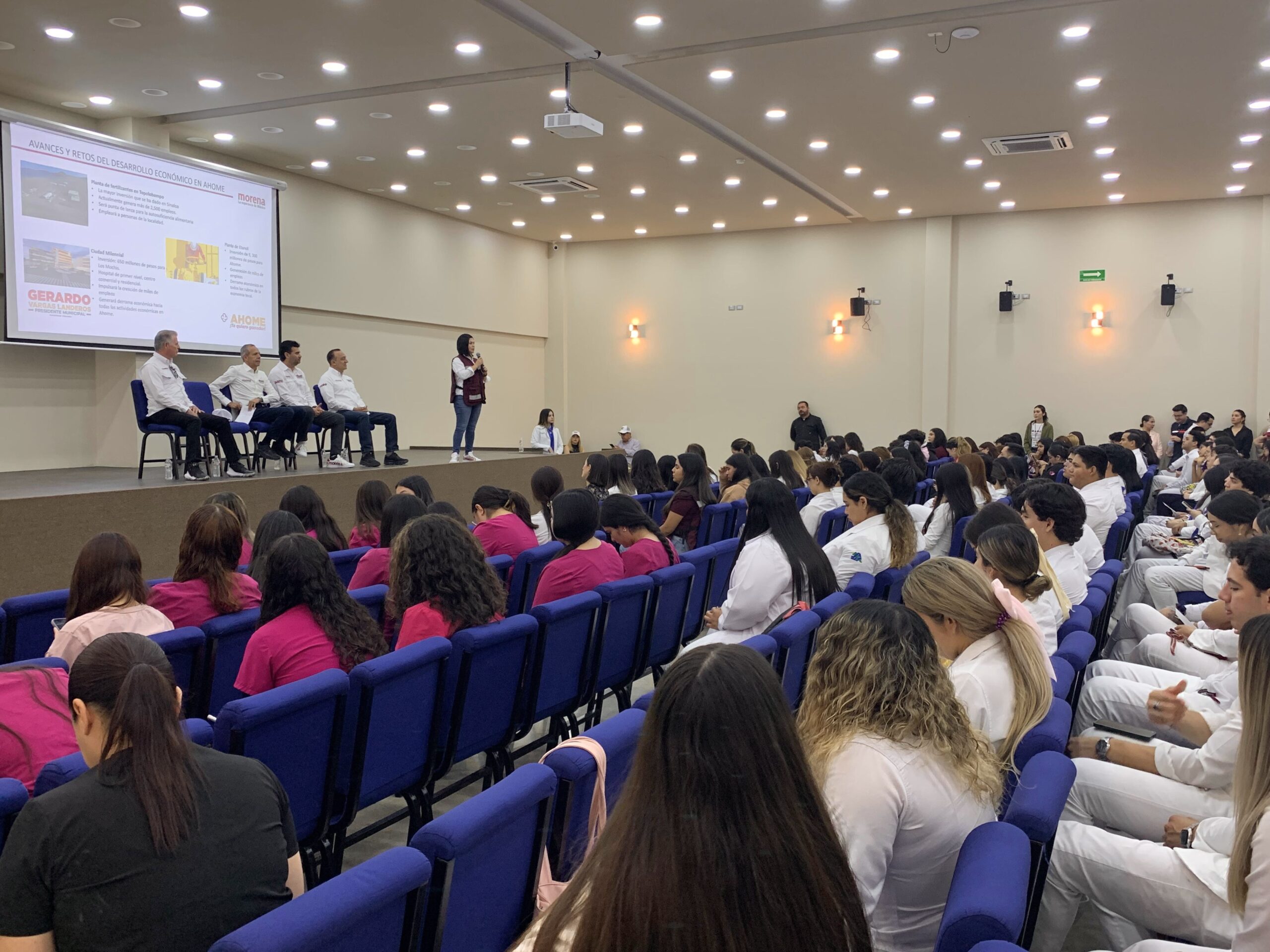 En el encuentro con estudiantes estuvieron presentes la doctora Maria Luisa Gómez Lizarraga directora de la Universidad de Los Mochis quien fue la anfitriona de este evento a acompañada de docentes y personal.