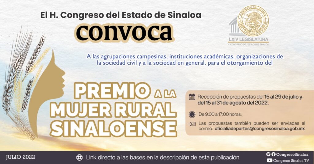El Poder Legislativo lanzó la Convocatoria “Premio a la Mujer Rural Sinaloense» dirigida a las agrupaciones campesinas, instituciones académicas, organizaciones de la sociedad civil y a la sociedad en general.