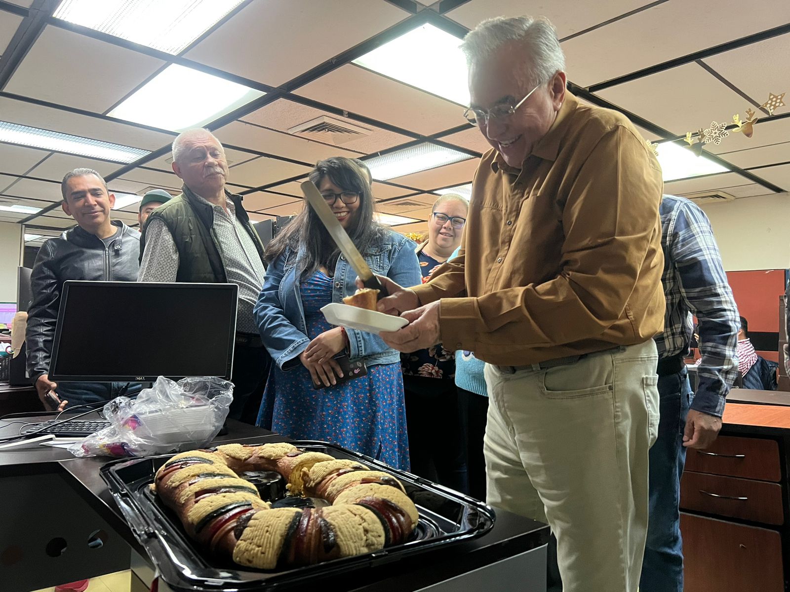 Con ese doble motivo de saludo, el de Año Nuevo y del Día de Reyes, Rocha Moya continuó hasta la una de la tarde con su recorrido, y como ya empezaba a hacer hambre preguntó a manera de broma al entrar a una oficina que no tenían la tradicional rosca: