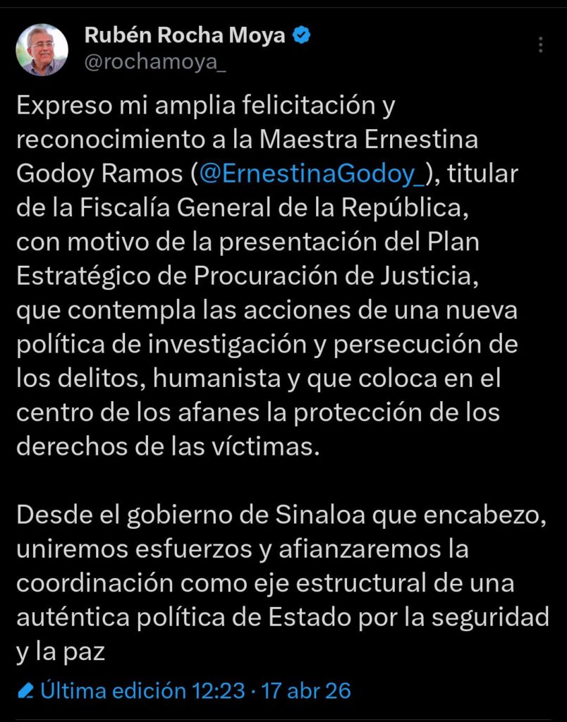 Ciudad de México, a 17 de abril de 2026.- El gobernador Rubén Rocha Moya asistió como invitado especial de la fiscal general de la República, Ernestina Godoy Ramos, a la presentación del Plan Estratégico de Procuración de Justicia 2026-2029, que presentó públicamente desde el Centro Cultural del México Contemporáneo, en el centro histórico de la Ciudad de México.